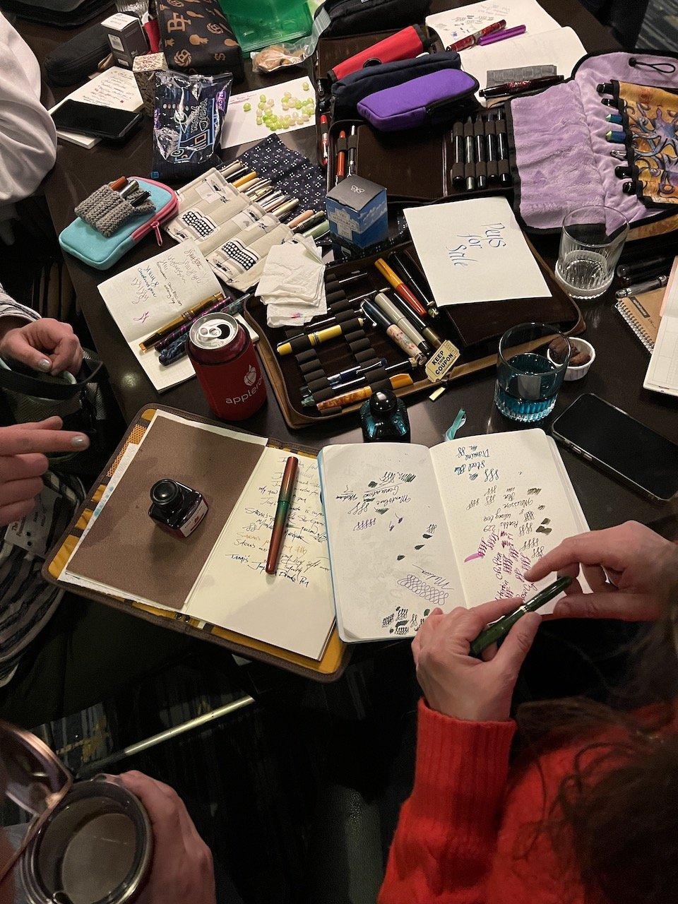 Lots of pens and inks and drinks at one of the tall tables at BWI.